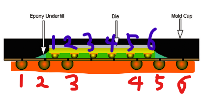 이것은 노란색 범프와 주황색 볼이 연결되어 있음을 의미합니다. 실제 칩을 테스트하기 위해 이러한 외부 주황색 볼(핀이라고도 함)에 신호를 보내 테스트를 수행합니다.