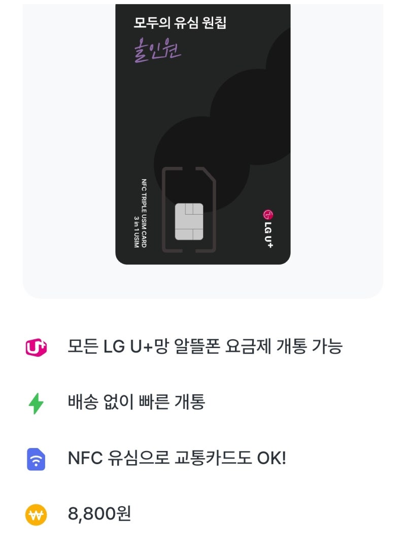 One Chip NFC SIM은 LG의 공개 USIM입니다. 소매 업체는 E -Mart 24, Online Shopping Mall, Baemin B -Mart에서 구입할 수 있으며 가격은 8,800 원입니다.
