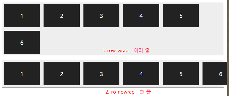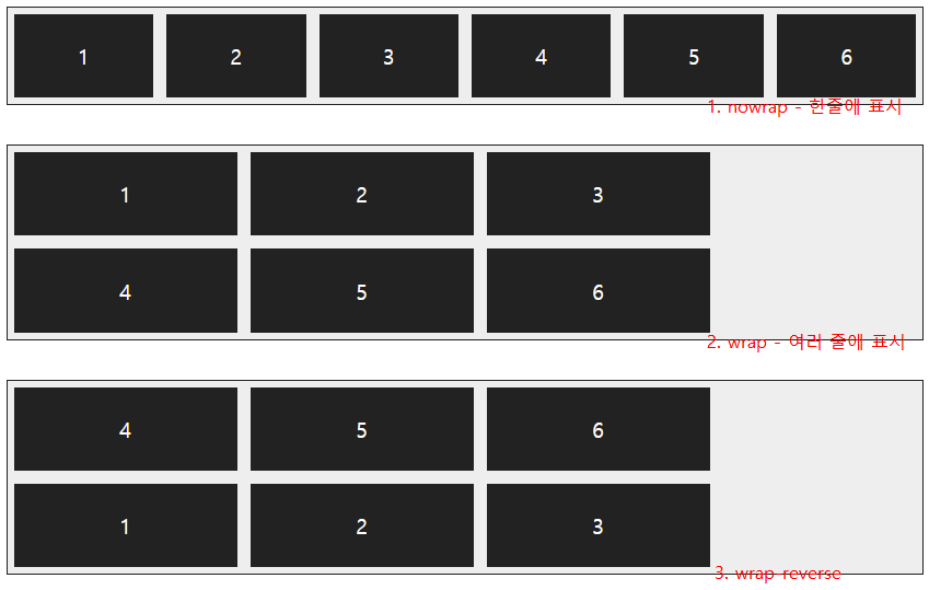 - nowrap (기본값): 플렉스 항목을 한 줄에 표시합니다.