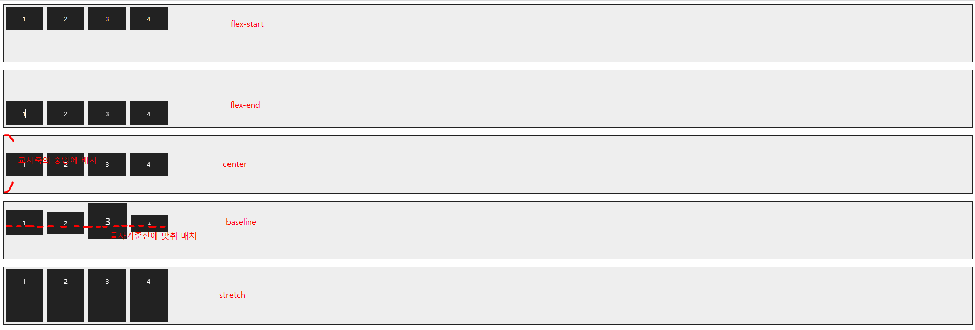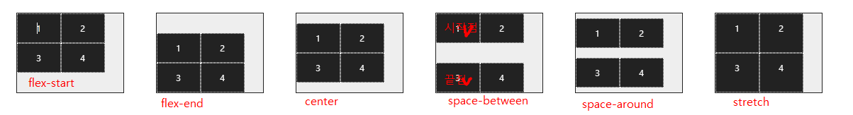 - flex-start: 주축의 시작점에 정렬