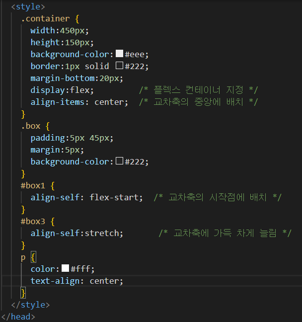 -align-items는 플렉스 컨테이너를 지정하는 선택기에 지정되고 align-self는 플렉스 항목을 지정하는 선택기에 지정됩니다.