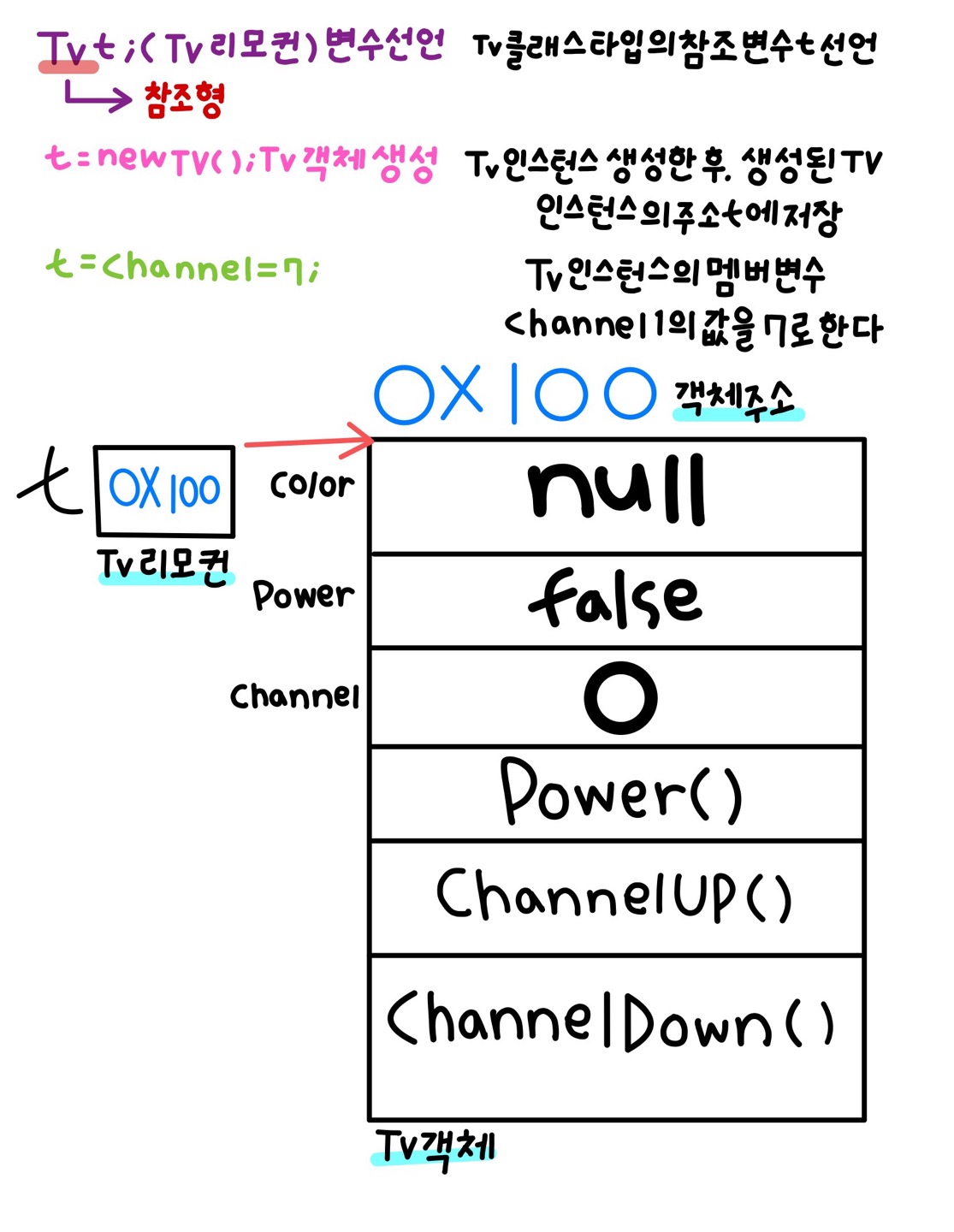t.channel = 7; // Tv 인스턴스의 멤버변수 channel의 값을 7로 정함
